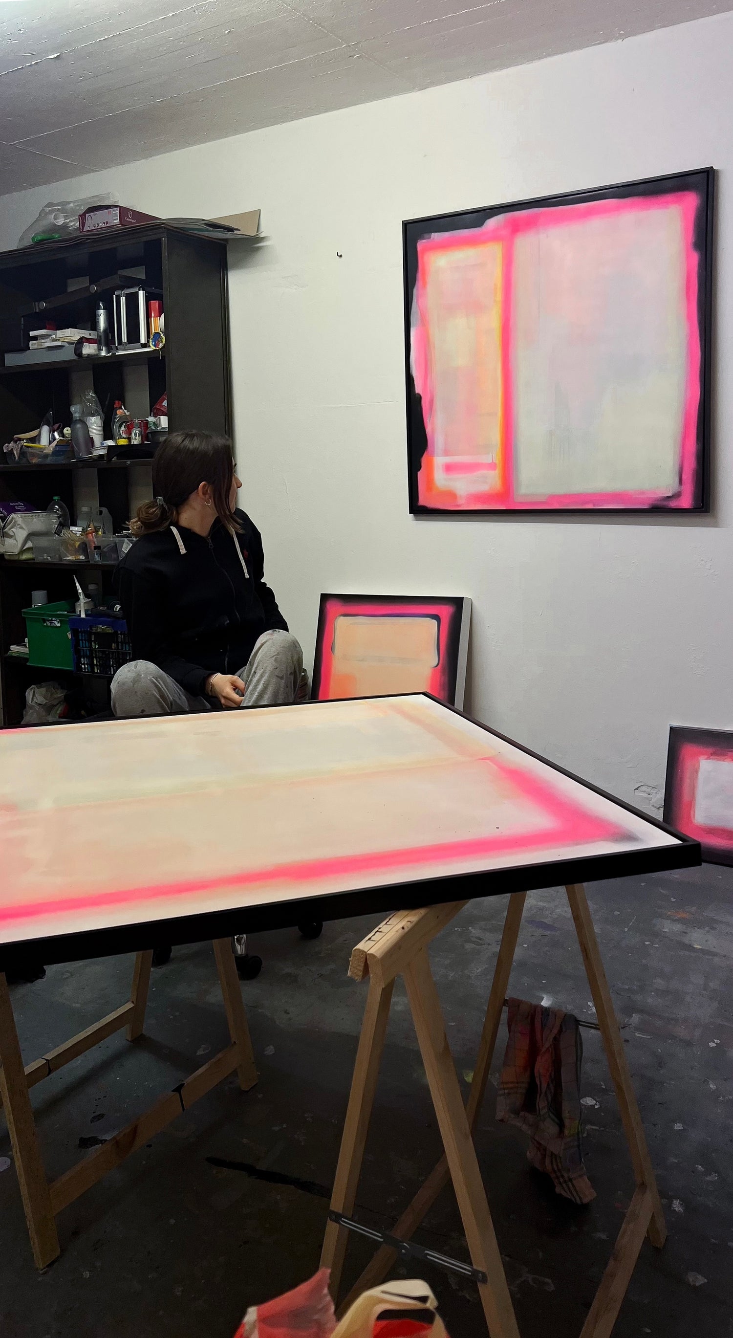 Kiara Knevels schafft kraftvolle Bildflächen, in denen Sprache, Farbe und Emotion ineinandergreifen. Mit grellen Farbverläufen, handschriftlichen Texten und abstrahierten Formen verhandelt sie Themen wie Verletzlichkeit, Wut und Selbstbehauptung. Ihre Arbeiten wirken roh und unmittelbar – wie visuelle Notizen eines inneren Aufbegehrens.