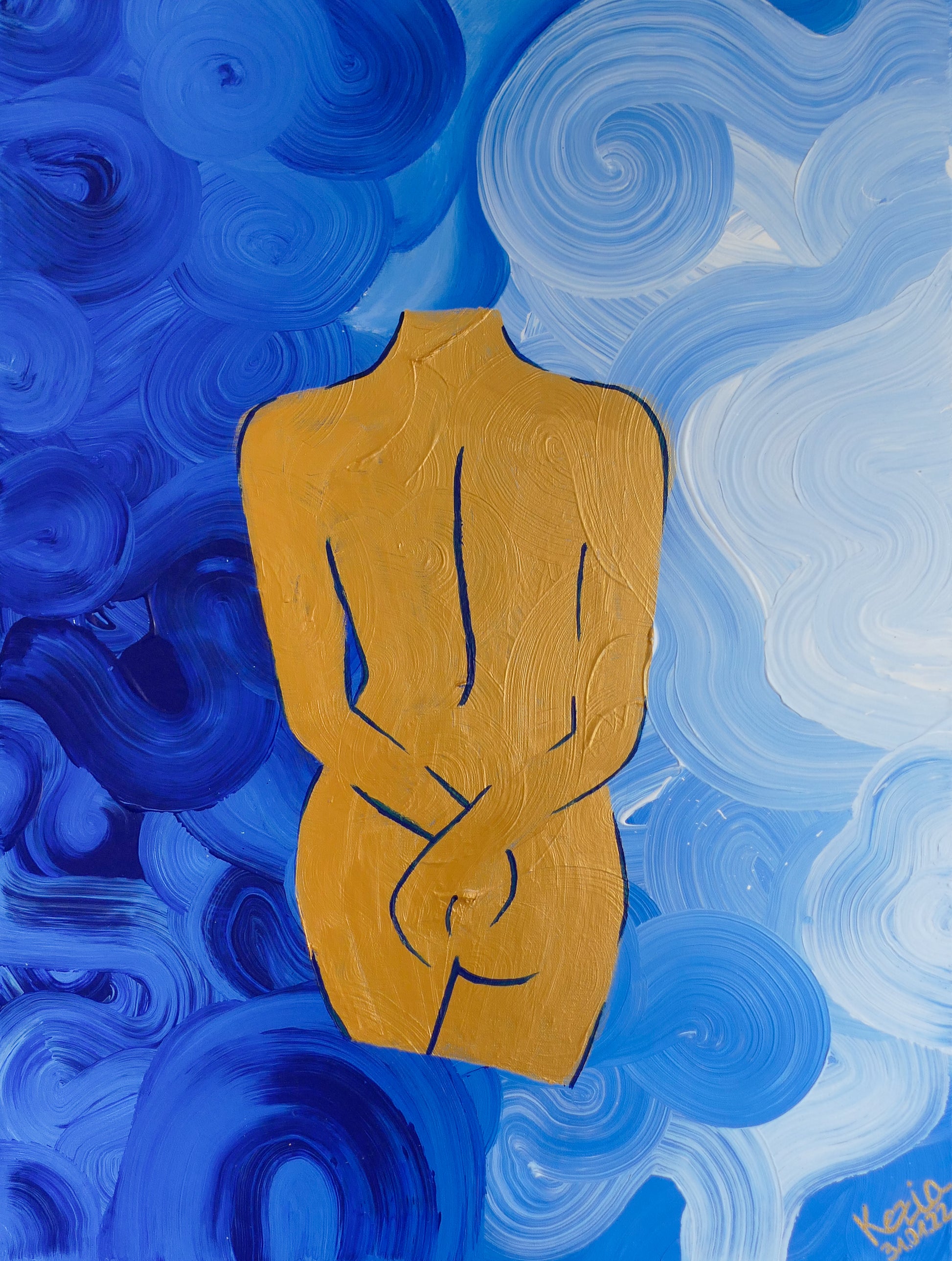 Kezia N°3 zeigt eine Figur in der Schwebe, reduziert auf das Wesentliche und mit ruhiger Hand gezeichnet. Der Körper wird zum Zeichen statt zum Porträt, entzieht sich der Erzählung und beharrt gleichzeitig auf Präsenz.