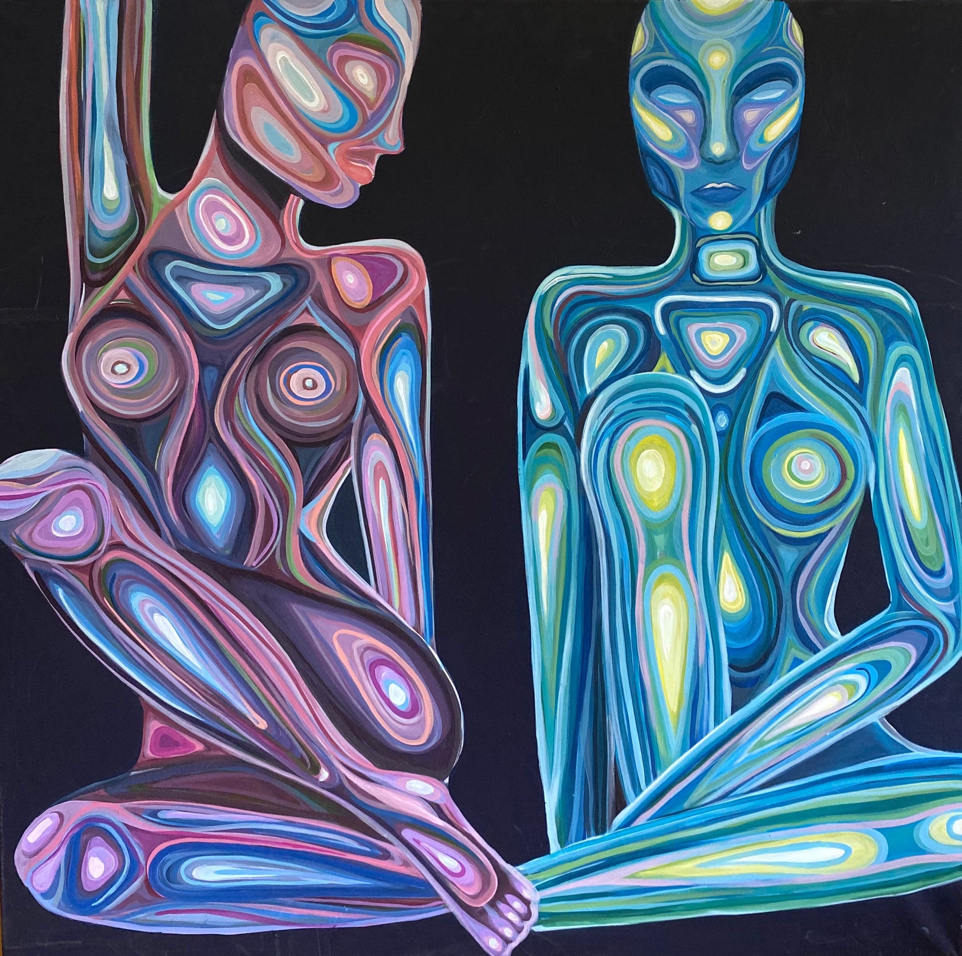 Lisanne Nr°1 inszeniert eine stille Begegnung: Zwei Körper, dargestellt als Farbflächen, Kontur zum Signal, Haut zur Landkarte. Die Figuren wahren Distanz, doch das Gemälde drängt auf Verbindung – Rhythmus begegnet Rhythmus auf dunklem Grund.