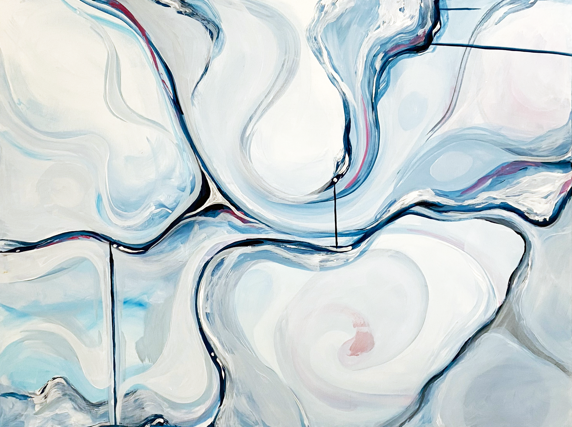 Lisanne Nr°2 erzeugt ihre Spannung im Spannungsfeld zwischen Drift und Struktur. Sanfte Strömungen in Hellblau und Perlmutt bewegen sich wie ein Atemzug, unterbrochen von dunklen Nähten, die die Oberfläche zusammenhalten.