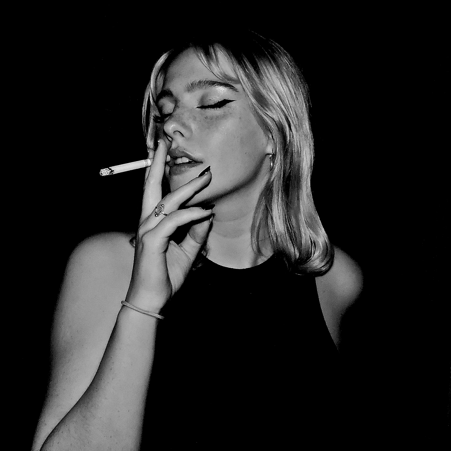 In Schwarz-Weiß wird Glamour zur Tatsache. Das Bild lebt von Kontrast und Zurückhaltung und lässt Konturen, Haut und Rauch die Geschichte ohne Erklärung erzählen.